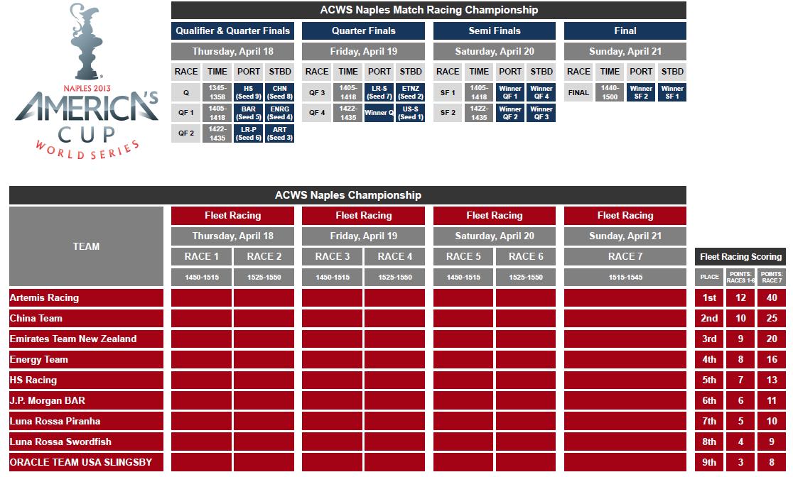 Dopo una giornata di allenamenti il 16 aprile, i catamarani AC45 cominceranno a gareggiare il 17, quando si disputeranno le regate preliminari di qualifica. Dal 18, poi, inizieranno i match race tra i vari team. Ad aprire le World Series di Napoli sarà la sfida tra gli austriaci di HS Racing e China Team alle ore 13:45. Luna Rossa Piranha, invece, sarà nelle acque del Golfo di Napoli poco dopo, quando sfiderà gli svedesi di Artemis.