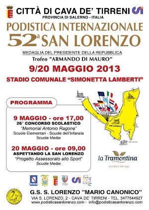 Giovedì 9 maggio la 26ª edizione del “Concorso Scolastico – Memorial Antonio Ragone”, riservato agli alunni delle scuole medie, elementari e dell’infanzia. Lunedì 20 maggio la prova unica dell’11ª edizione del progetto “Aspettando la San Lorenzo” per gli studenti delle scuole medie. Il doppio appuntamento allo stadio “Simonetta Lamberti” di Cava de’ Tirreni (Sa) rappresenterà l’attesa anteprima della 52ª “Podistica Internazionale S. Lorenzo” – Trofeo Armando Di Mauro, organizzata