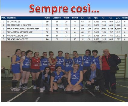 Domenica 19 è in programma la sfida chiave per il terzo posto, che vedrà la NPS sfidare in casa l’ASD Cava, che è guidata dall’ex tecnico della compagine sarnese Fiorillo; un solo punto divide le due squadre, la posta in gioco è dunque altissima.