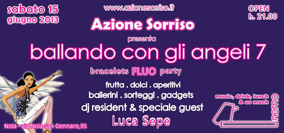Nola. Sabato 15 giugno, Azione Sorriso presenta l’annuale serata disco di solidarietà: “Ballando con gli Angeli 7”, che coniuga giovani, divertimento, colori, alla solidarietà, Testimonial d’eccezione: Luca Sepe. “Divertirsi facendo del bene”: questo il motto che spinge i volontari della Onlus a impiegare energie e tempo per il buon esito della festa e per arrivare al cuore di tanti giovani.