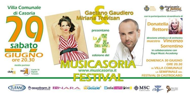Sulla scia dei successi delle precedenti edizioni, sabato 29 giugno alle 20.30 presso la Villa Comunale di Casoria (via Pio XII), si terrà la quarta edizione del MUSICASORIA, il festival più accreditato del Sud Italia, a cui anche RAI DUE e RAI NEWS riserveranno ampio spazio nei propri programmi di informazione. La kermesse, ideata e diretta con la sua orchestra, dal M° Vincenzo Sorrentino, sarà presentata dall’eclettico speaker radiofonico e televisivo Gaetano Gaudiero, affiancato da Miriana Trevisan, storica velina di “Striscia la Notizia” e valletta di Mike Bongiorno su Canale 5.