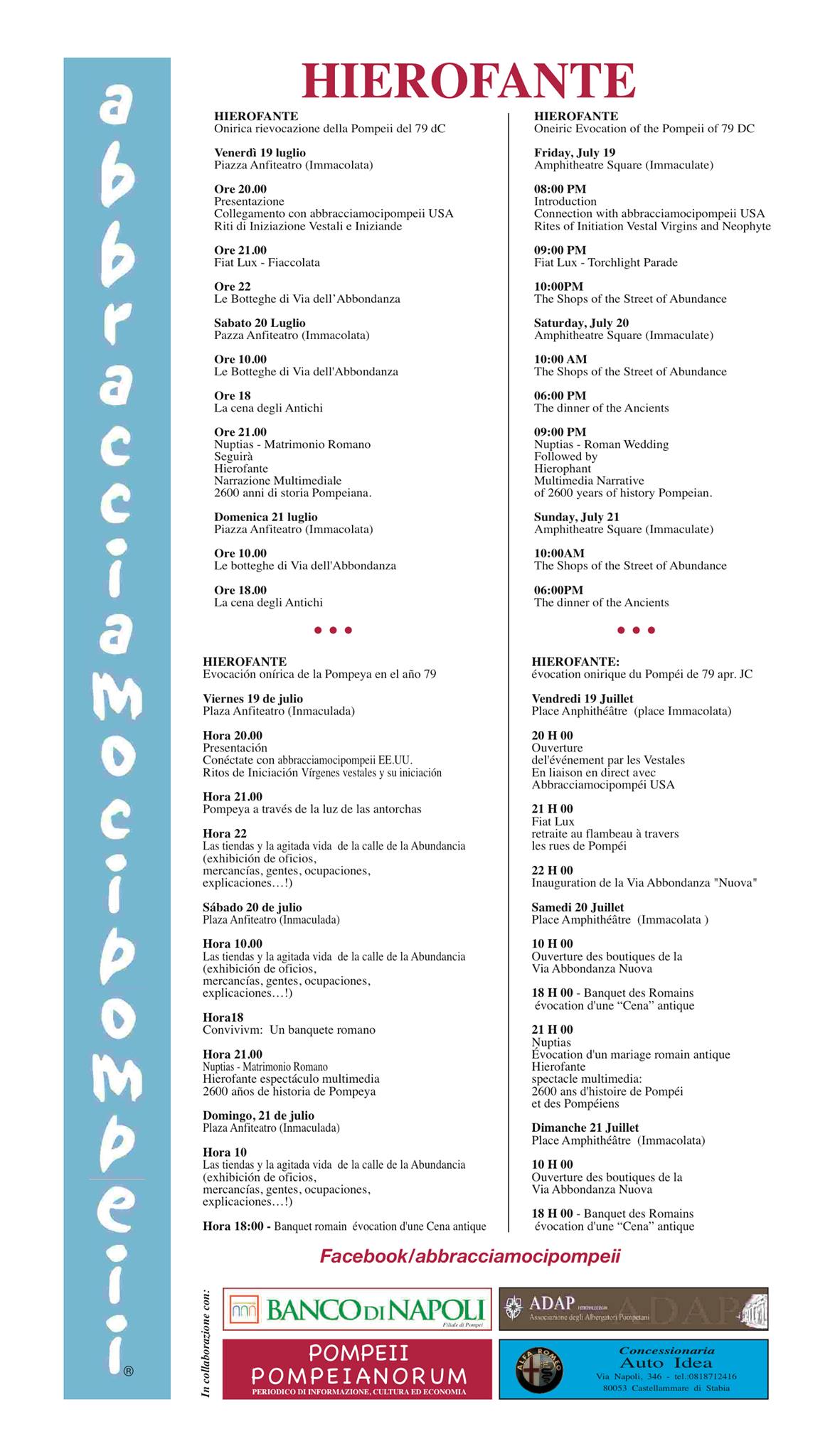 Nuove adesioni al progetto «abbracciamociPompeii» promosso dal Comitato Cincinnato. Dopo gli operatori commerciali a supportare concretamente l’iniziativa sono arrivati gli albergatori, che hanno deciso di rendere disponibili le loro strutture con mirati pacchetti turistici, per l’accoglienza dei visitatori prevista nel corso della manifestazione, in programma a Pompei dal 19 al 21 luglio prossimo. Inoltre, con grande generosità gli imprenditori economici, guidati da Rosita Matrone presidente Adap (l’associazione albergatori) ospiteranno, gratuitamente nelle loro prestigiose strutture, i componenti del gruppo Francese e del gruppo Spagnolo che animeranno le Botteghe di Via Dell’Abbondanza Nuova. L’iniziativa a cui ha già dato il proprio patrocinio morale il comune mariano, prevede la creazione di una vera e propria unione tra città antica e città moderna, attraverso una traslazione di quest’ultima sul modello delle realtà locali tipiche della civiltà di duemila anni fa. A tale scopo, un gruppo di Vestali Francesi appartenenti a due team internazionali di rievocazione storica, arriveranno a Pompeii alcuni giorni prima dell’evento per aiutare le “Iniziande” (Vestali Pompeiane) a prepararsi in maniera consona allo svolgimento dei riti d’Iniziazione. In particolare, gli organizzatori dell’evento hanno lanciato un appello all’intera comunità pompeiana nella speranza che i cittadini di Pompei, famosi per il loro spirito di accoglienza, contribuiscano a preparare al meglio l’intera città magari con l’utilizzo di abiti e acconciature di moda nella Pompei di 2000 anni fa. Già nelle scorse settimane alcuni negozianti del centro cittadino hanno incominciato ad allestire all’esterno delle proprie attività arredi e illuminazioni riecheggianti l’Antica Pompei. «Con questa idea – spiega Felice Bergamasco portavoce del Comitato Cincinnato – miriamo a coinvolgere l’intera città nel racconto della propria storia. Una simile esperienza ha già riscosso successi in altre realtà locali. Infatti circa 30 anni fa nel 1986, su proposta di Enzo Celone, scenografo della Rai Radiotelevisione Italiana, decisi di produrre, insieme a Ezio Bouchè altro imprenditore Pompeiano, un filmato che raccontasse la storia della “Pergamena Bianca” (una sorta di assegno in bianco, mai incassato dai Cavesi, emesso dal re di Spagna a titolo di ringraziamento ai Cavesi che accorsero, spontaneamente, in aiuto del re spagnolo Ferdinando I d’Aragona – detto Ferrante – che stava per essere sconfitto dal re Giovanni d’ Angiò). Il filmato venne, successivamente, acquistato dalla Rai e messo in onda svariate volte. Inoltre è stato usato ripetutamente per promuovere il turismo cavese in varie mostre e fiere internazionali. In quella fortunata occasione ebbi modo di scoprire il mondo della rievocazione storica pieno di persone di buona volontà che, con estrema umiltà e amore per il proprio territorio e, soprattutto, disinteressatamente facevano a gara per mostrare al mondo le bellezze del proprio territorio. La mia speranza, mai sopita, è sempre stata quella di ripetere con l’aiuto dei Pompeiani e non quella magnifica esperienza». Al progetto «abbracciamociPompeii» intanto continuano a giungere moltissimedi adesioni da tutto il Pianeta. Infatti, il Comitato Cincinnato, comunica con i propri sostenitori attraverso la pagina di «Pompeii Pompeianorum news» presente sul social net-work facebook che sta dando la possibilità a tutti di seguire in diretta ogni fase di quest’evento. Proprio per sottolineare il ruolo che hanno avuto e possono avere i nuovi strumenti di comunicazione di massa, nella serata inaugurale dell’evento, è previsto un collegamento in videoconferenza con Silvana La Creta Ravena portavoce di abbracciamocipompeii USA. Tutto ciò a testimonianza del fatto che parlare di Pompei o pensare ad un progetto per Pompei, non possa essere un atto limitato, ma qualcosa che deve coinvolgere l’intera umanità.