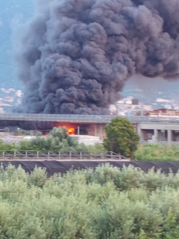 Pauroso incendio a via Vecchie Fontanelle: le fiamme si sono propagate da un deposito di lamiere e panelli coibentati. Il rogo di grandi dimensioni ha provocato la formazione di una grossa nube di fumo nero che ha limitato la visibilità sul raccordo della statale 145. A rischio anche la circolazione dei treni della Circumvesuviana, i cui binari si trovano a pochi metri dall’incendio. Il deposito è in una zona adiacente alla stazione Circumvesuviana di Pioppaino e proprio nei pressi della statale. Le fiamme sono arrivate a lambire alcune abitazioni site a pochi passi dalla fabbrica, in molti sono stati costretti ad abbandonare le proprie case. Sul posto sono giunti i vigili del fuoco, carabinieri e polizia municipale. I vigili del fuoco al momento sono ancora impegnati nel domare le fiamme. Ancora ignote le cause dell’incendio su cui indagano i carabinieri della compagnia stabiese. La nube di fumo nero, propagata dal materiale plastico e copertoni di pneumatici, ha raggiunto anche i quartieri confinante come il Savorito, Moscarella e San Marco.
