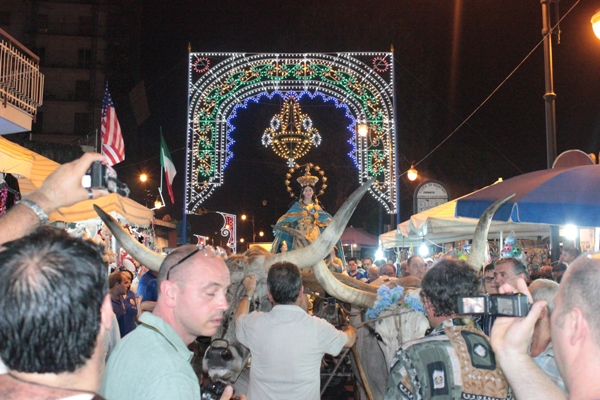 Alle 22:30 circa, subito dopo la tradizionale “batteria” di fuochi d’artificio della contrada Cappelle, la processione parte attraversando via S. Antonio Abate e via Pietro Melchiade fino a fermarsi per qualche minuto sul ponte di via Roma, lo stesso luogo dove si narra che abbia deciso di fermarsi 300 anni prima. L’atmosfera di fede e tradizione popolare sprigionata dalla sacra effige che si erge tra la gente, le bancarelle della festa e la moltitudine di teste è veramente indescrivibile, le corna dei buoi che precedono la statua incorniciano il volto della Madonna creando qualcosa di magico agli occhi di tutti coloro che osservano la scena. Alle 23:10 il carro giunge davanti l’ingresso della chiesa e la Madonna delle Vergini viene riposta al suo interno, nel frattempo la banda che accompagnava il corteo si sistema sul palco di Piazza Vittorio Veneto allietando gli spettatori con dolci e raffinate melodie.