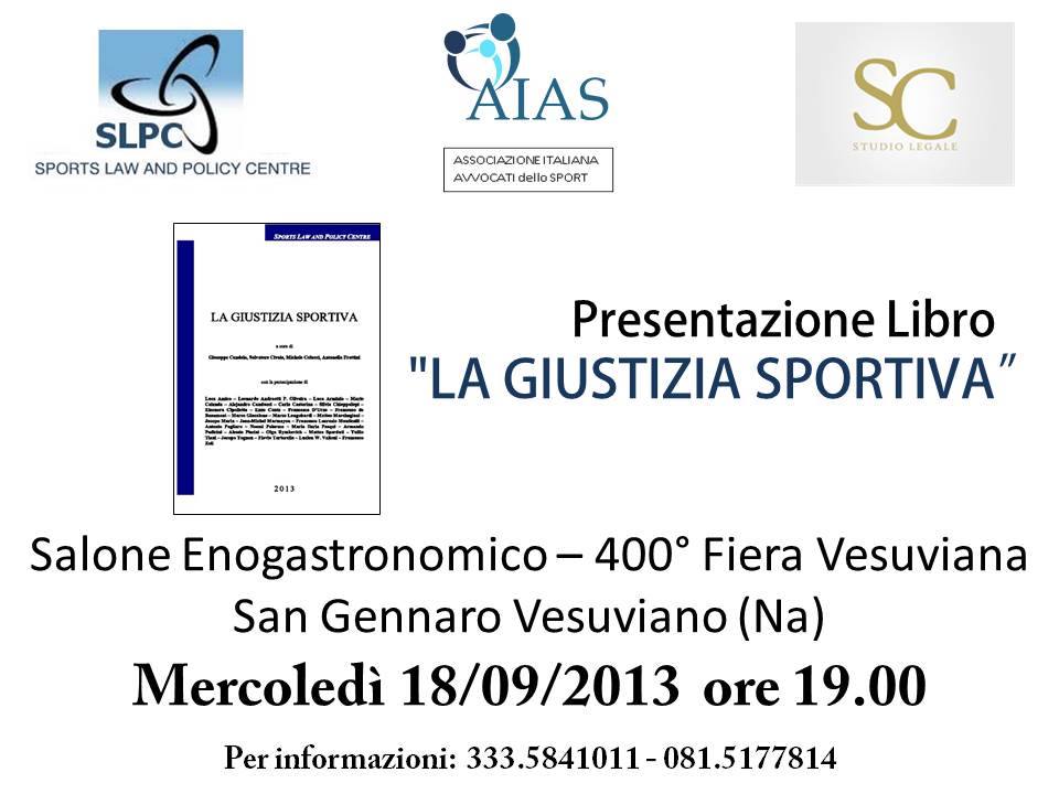 Esperti della materia ed autorità sportive si incontrano Mercoledì 18 Settembre 2013, alle ore 19, presso il Salone Enogastronomico della 400° Fiera Vesuviana, a San Gennaro Vesuviano (Na), per la seconda presentazione del libro “La Giustizia Sportiva”, edito dallo Sports Law and Policy Centre di Roma, a cura – fra gli altri- del Prof. Avv. Michele Colucci, Membro della FIFA Dispute Resolution Chamber e docente di Diritto Internazionale dello Sport presso l’Università di Tilburg (Olanda), l’ISDE- Madrid, e Direttore della Rivista di Diritto ed Economia dello Sport e dell’Avv. Salvatore Civale, Presidente dell’A.I.A.S. – Associazione Italiana Avvocati dello Sport.