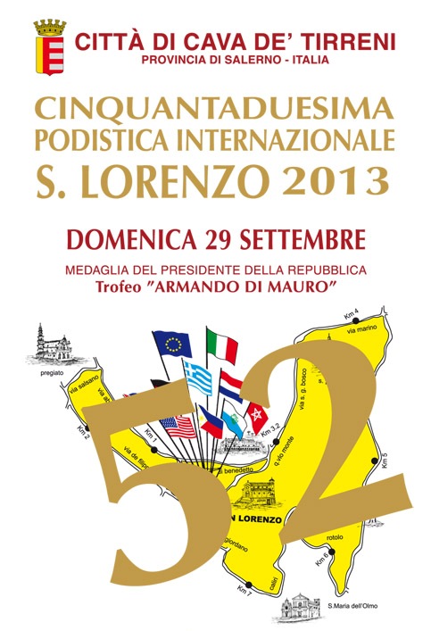 Giovedì 26 settembre 2013, alle ore 11.30, presso l’Aula Consiliare del Palazzo di Città di Cava de’ Tirreni (Sa), si svolgerà la conferenza stampa di presentazione della 52ª edizione della “Podistica Internazionale S. Lorenzo” – Trofeo Armando Di Mauro.