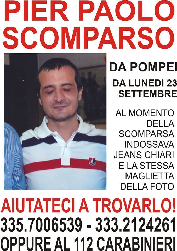 Una testimonianza che restituisce l’immagine di un ragazzo come tanti. Ma allora perchè si sono perse le tracce di Pier Paolo? Questa è la domanda ricorrente. Domada per la quale una risposta potrebbe essere ricercata nel dramma della perdita del lavoro. Ed intanto, sul web cresce la catena della condivisioni della locandina che ritrae il giovane pompeiano al momento della scomparsa. E sotto vengono indicati i numeri utili per dare un contributo fattivo alle ricerche. Chiunque sappia qualcosa o abbia visto Pier Paolo potrà mettersi in contatto con i militari dell’Arma.