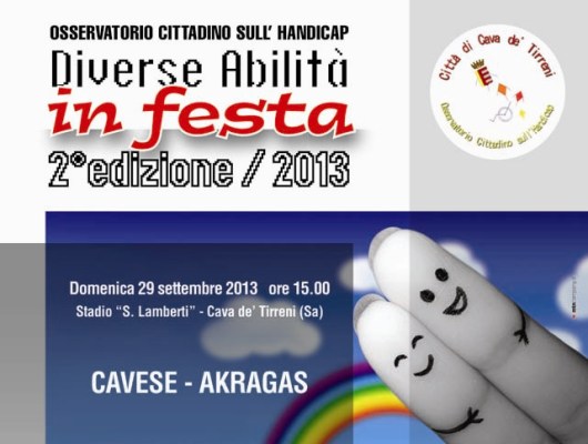 «Lo sport come momento di aggregazione, perché la diversa abilità non è un marchio, né una malattia»: è questo il messaggio che domenica 29 settembre i calciatori ed i dirigenti della U.S.D. Cavese 1919 promuoveranno allo stadio “Simonetta Lamberti” di Cava de’ Tirreni (Sa) in favore dell’iniziativa “Diverse abilità in festa”, promossa per il secondo anno consecutivo dall’Osservatorio cittadino sull’handicap.
