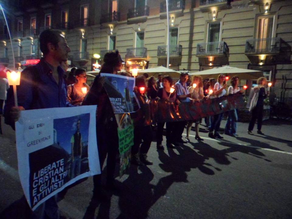Mobilitazione a Napoli a favore dell’ attivista di Greenpeace Cristian D’Alessandro. Raccolte 6500 firme per la liberazione dopo la fiaccolata sul lungomare con centinaia di persone.