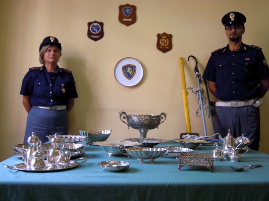 A questo punto, il conducente della Fiat anziché fermarsi al segnale ordinatogli, ha schiacciato il piede sull’acceleratore e si è dato alla fuga con pericolosissime manovre. Nel corso dell’inseguimento i fuggitivi hanno esploso numerosi colpi di arma da fuoco contro la pattuglia, senza tuttavia riuscire a colpirla. Gli Agenti hanno risposto al fuoco e i malviventi, ormai braccati, sono stati costretti ad abbandonare l’autovettura dileguandosi a piedi in un vigneto. Dopo la rocambolesca fuga dei ladri, gli agenti hanno comunque recuperato il veicolo utilizzato dai tre soggetti che è risultato essere rubato. All’interno della vettura, è stata rinvenuta refurtiva, ossia 21 pezzi di argenteria pura trafugata nelle ore precedenti dagli stessi, per circa 20 Kg, argenteria che al termine delle indagini sarà restituita ai legittimi proprietari.
