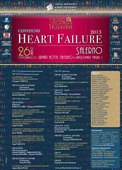 Dopo i saluti del Presidente dell’Ordine dei Medici e degli Odontoiatri della Provincia di Salerno, Bruno Ravera e del Direttore Generale dell’Ospedale San Giovanni di Dio e Ruggi d’Aragona, Elvira Lenzi, e la presentazione del dott. Giovanni D’Angelo, interverranno: Giuseppe Lauriello (Scompenso Cardiaco e Scuola Medica Salernitana), Roberto Ferrari (Scompenso Cardiaco: il mio lungo viaggio).