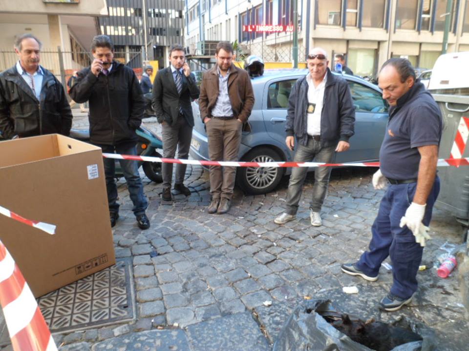“A Via De Gasperi all’ altezza del civico 33 stamattina l’ avvocato Alessandro Conte si è insospettito – raccontano il leader degli ecorottamatori Verdi Francesco Emilio Borrelli subito accorso sul posto e Gianni Simioli della Radiazza – perchè davanti al palazzo dove si trova il suo studio e abitano diversi professionisti c’ era un grande sacco della spazzatura grondante di sangue.