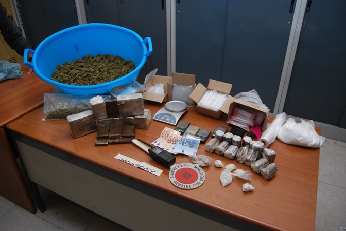 All’interno di una scatola, posta sul tavolo del soggiorno, gli agenti hanno quindi trovato un notevole quantitativo di sostanze stupefacenti: circa 1100 grammi di marijuana, circa 1100 grammi di hashish, 22 grammi circa di cocaina e 55 circa di extasy. Nella scatole c’era era anche del materiale per il dosaggio ed il confezionamento della sostanza stupefacente. Nell’armadio della camera da letto sono state trovate anche delle banconote per un totale di 240 euro e circa 760 grammi di una sostanza generalmente usata per il taglio. Sul terrazzo di pertinenza all’appartamento, all’interno di una scarpiera, i poliziotti hanno infine trovato circa 4500 grammi di hashish in polvere e circa 680 grammi della stessa sostanza ma in stecche. Tutto quanto il rinvenuto è stato posto sotto sequestro.