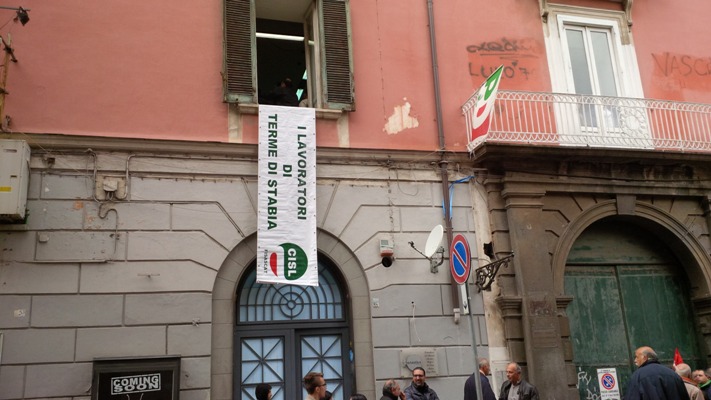 hanno deciso di raggiungere via Bonito ed entrare al palazzetto del mare dove stava per iniziare un convegno sulle mafie alla presenza del primo cittadino stabiese. Quest’ultimo non è arrivato, forse perchè avvertito del cambiamento di programma attuato dai lavoratori di Terme di Stabia: l’ultima visita di Cuomo al palazzetto di via Bonito risale alla scorsa estate quando andò in scena una dura protesta dei termali quando pronunciò le stesse parole – cessione di rami d’azienda e nessuna certezza sulla salvaguardia di tutti i posti di lavoro – che hanno fatto scattare la nuova mobilitazione. Non paghi, i manifestanti hanno trasferito la loro protesta alla sede del Pd al corso Vittorio Emanuele che è stata occupata per alcune ore. Una scelta non casuale. All’interno dell’area politica democrat stabiesi non c’è particolare unità su varie questioni a partire dalla vertenza Terme e il dissesto finanziario dell’Ente comunale che il sindaco Cuomo si prepara a proclamare. Cori e affissione di striscioni alla sede del Pd per chiedere proprio ai democratici stabiesi di prendere una posizione sulla vertenza dopo la linea dettata dal primo cittadino che propende per la messa in liquidazione di Terme. Il tutto proprio mentre in queste si aprono i lavori del congresso cittadino del Pd per eleggere il nuovo segretario cittadino che dovrà raccogliere l’eredità di Cuomo: in lizza i due renziani Peppe Giordano e Toni Pannullo, ex capogruppo consiliare.