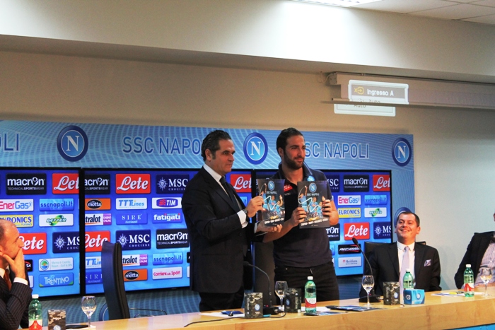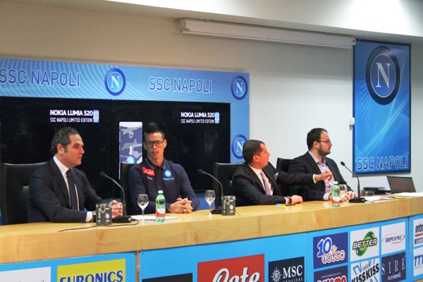 Apre la conferenza stampa Alessandro Formisano: “ Ormai è il quinto anno che noi abbiamo una collaborazione stabile con Nokia, nel 2008 è stata una delle prime a realizzare con noi uno dei prodotti innovativi nel mondo del calcio, di una edizione limitata associata al calcio Napoli, personalizzando uno dei suoi prodotti migliori della gamma con il nostro marchio. Ci saranno tre versioni una Marek hamsik edizione limitata, una Gonzalo Higuain edizione limitata, ed una SSC Napoli edizione limitata. Presentiamo anche la App ufficiale del Calcio Napoli per Windows 8”.