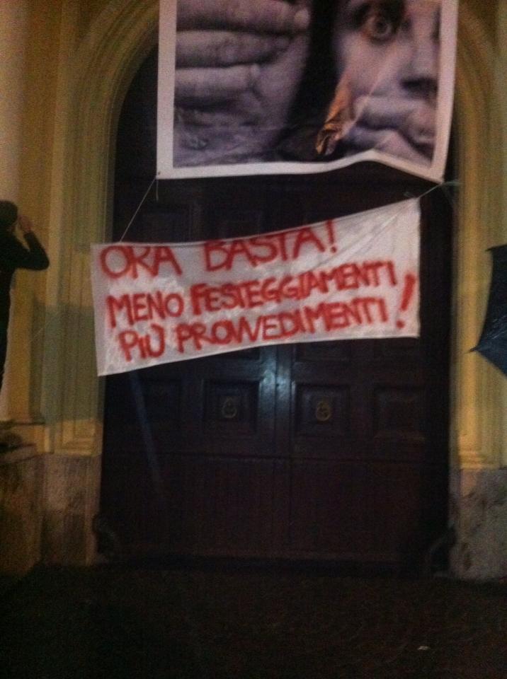 Prima di pubblicare l’articolo, ci siamo sincerati sulla bontà della notizia recandoci sul posto. Ed effettivamente lo striscione fino a tarda mattinata, campeggiava sulla porta di Palazzo De Fusco.