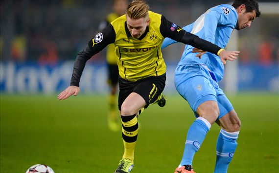 Il Napoli inizia bene il match cercando di gestire il gioco, aggressivo fin dai primi minuti però al 10′ minuto è già Borussia Dortmund, Federico Fernandez commette un’ingenuità, che trattiene Lewandowski in area a palla lontana, regala il rigore agli avversari: Reus spiazza Reina e gli schwarzgelben sono già in vantaggio. La strada per il Borussia è tutta in discesa e al quarto d’ora Mkhitaryan trova un varco e manda in porta Lewandowski ma il polacco sbaglia clamorosamente spedendo a lato. Neanche tre minuti e Reus sfiora il raddoppio su punizione ma Reina si fa trovare pronto e un gran colpo di reni devia in angolo.
