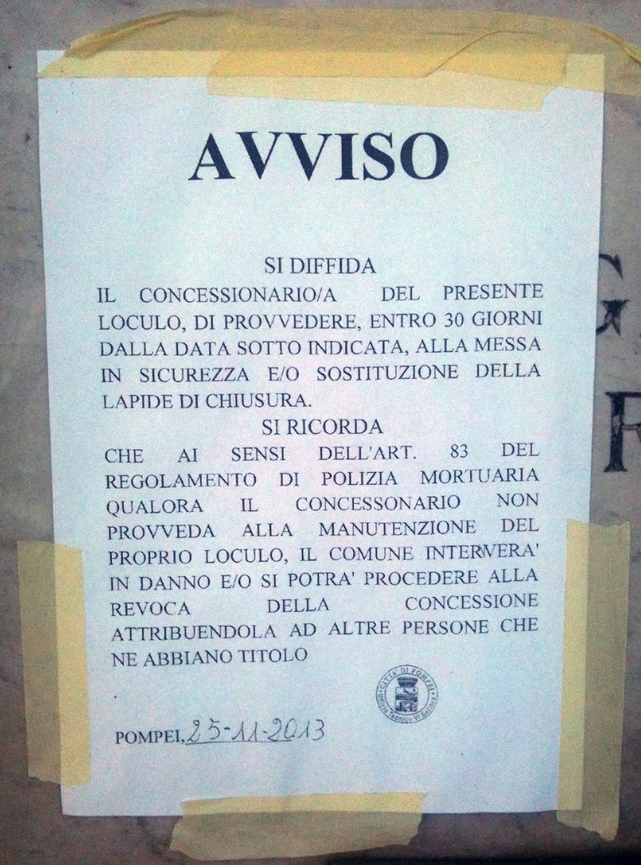E’ l’ultima novità, in oridine di tempo, del cimitero pompeiano. Un insolito avviso è comparso su diversi loculi. Informativa diramata in data 25 novembre 2013. Bisogna provvedere alla manutenzione delle lastre di chiusura dei loculi e, in generale alla manutenzione degli stessi. E bisogna farlo entro trenta giorni. Un avvertimento preciso che chiama in causa i cittadini. Perchè dovranno essere gli stessi a mettere mano alla tasca e provvedere ad eventuali lavori di messa in sicurezza. In caso contrario si rischierà la revoca della concessione del loculo che verrà attribuito a persone che ne abbiano titolo.