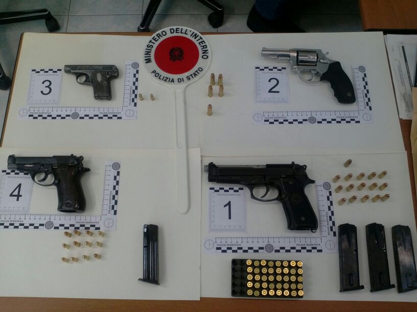 Le armi, una Beretta 9 X 21, una rivoltella Taurus calibro 38, una Galesi 6,35 ed una Beretta 81, sono state trovate all’interno di un foro praticato sotto uno dei tre scalini che portano al vano ascensore dal terrazzo dell’edificio situato al civico 21.