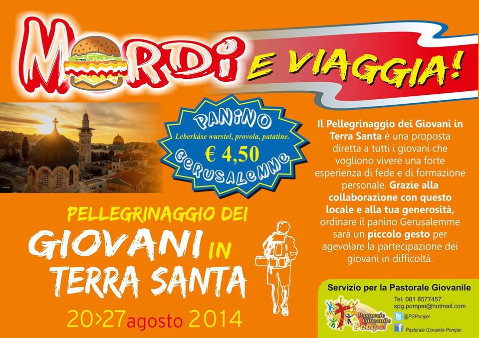 Favorire la partecipazione dei giovani al pellegrinaggio in Terrasanta. Agevolarli in un momento storico in cui sono tempi duri per le tasche. Questo lo spirito dell’iniziativa “Mordi e Viaggia”, promossa dall’ufficio della Pastorale Giovanile del Santuario di Pompei, diretto da don Ivan Licinio.