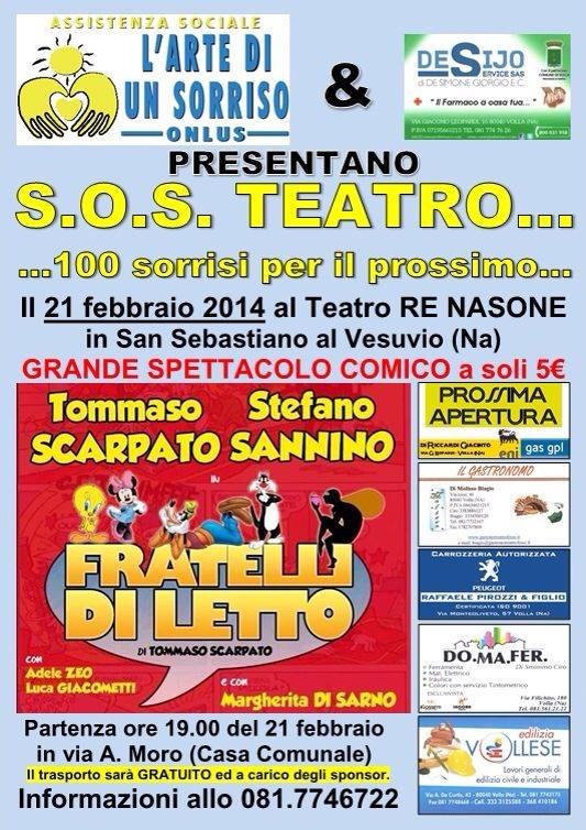L’Arte di un Sorriso Onlus, associazione attiva nel sociale, presenta “Sos Teatro”…100 sorrisi per il prossimo. La manifestazione si terrà domani sera al teatro Re Nasone a San Sebastiano al Vesuvio (grande spettacolo comico a soli 5 euro): Tommaso Scarpato e Stefano Sannino saranno i protagonisti di “Fratelli di letto”, uno spettacolo comico.