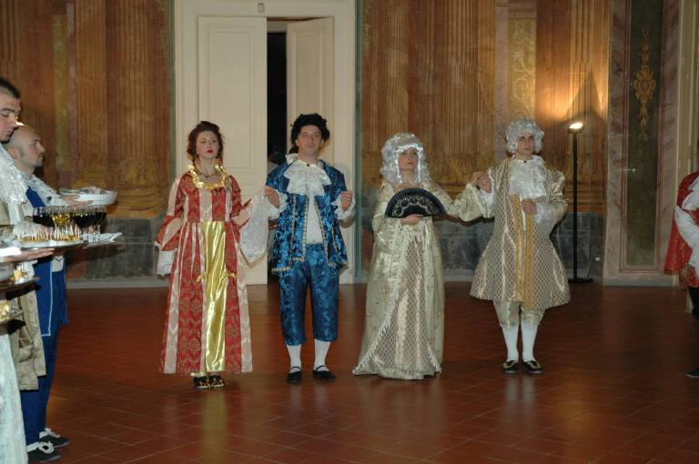 I figuranti passeggeranno tranquillamente nelle sale del palazzo, non curanti degli ospiti, dato il fervore palpabile dei preparativi. E mentre gli spettatori si accingeranno a scoprire le bellezze di Villa Campolieto, incontreranno i personaggi che fanno parte della storia del periodo. Così un “fanfarone” Re Ferdinando, una Regina Maria Carolina col pugno di ferro, un Vanvitelli estroso come tutti gli artisti, il suo piccolo e impertinente collaboratore, Luzio Di Sangro, un eccentrico padrone di casa, una serva estremamente insolente, e due “inciuciatori” del popolo catapulteranno “davvero” i partecipanti nel diciottesimo secolo.