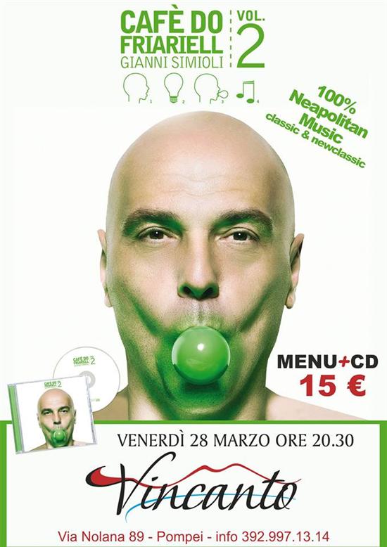 Nuovo grande appuntamento al Vincanto di Pompei. Venerdì 28 marzo direttamente da Radio Marte, Gianni Simioli presenterà il suo nuovo cd, “Cafè do friariell” vol.2, pubblicato da un’etichetta indipendente, la Jesce Sole, a distanza di 4 anni e 5000 copie vendute dal Vol.1.