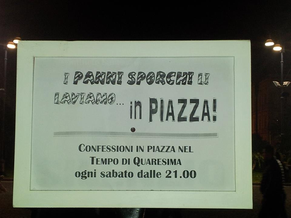 Ogni sabato e per tutto il periodo quaresimale, chiunque vorrà potrà incontrare i sacerdoti in piazza ed avvicinarsi al sacramento della confessione. “I panni sporchi li laviamo… in piazza”, questo il titolo scelto per l’iniziativa, salutata con entusiasmo al primo appuntamento di sabato scorso.