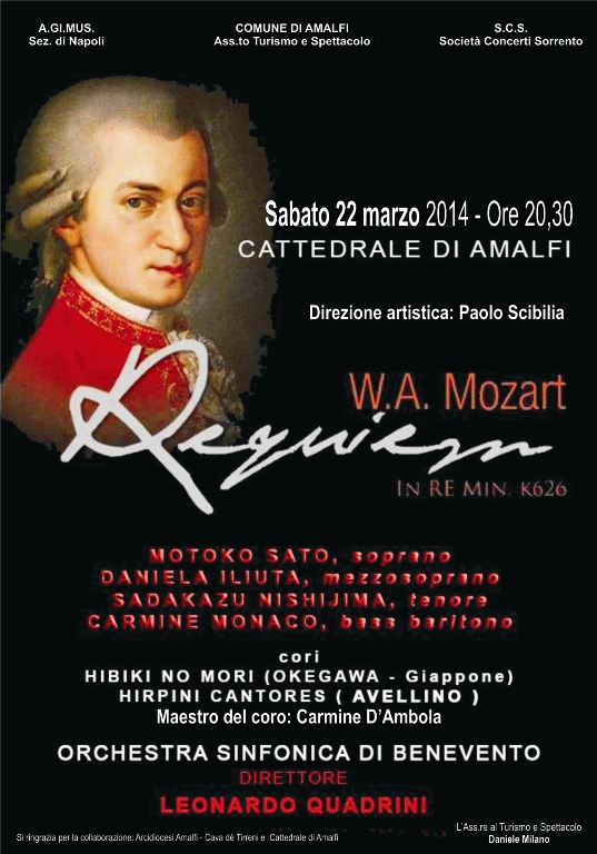 Sabato 22 marzo 2014 alle 20.30, nella Cattedrale di S. Andrea in Amalfi si terrà il concerto – evento per la terza settimana di Quaresima, con l’esecuzione del celebre “Requiem in Re min K626” di W. A. Mozart”. Interpreti saranno il Coro giapponese “Hibiki No Mori” della Città di Okegawa, la Corale “Hirpini Cantores” di Avellino e l’Orchestra Sinfonica del Sannio, diretti dal Maestro Leonardo Quadrini.
