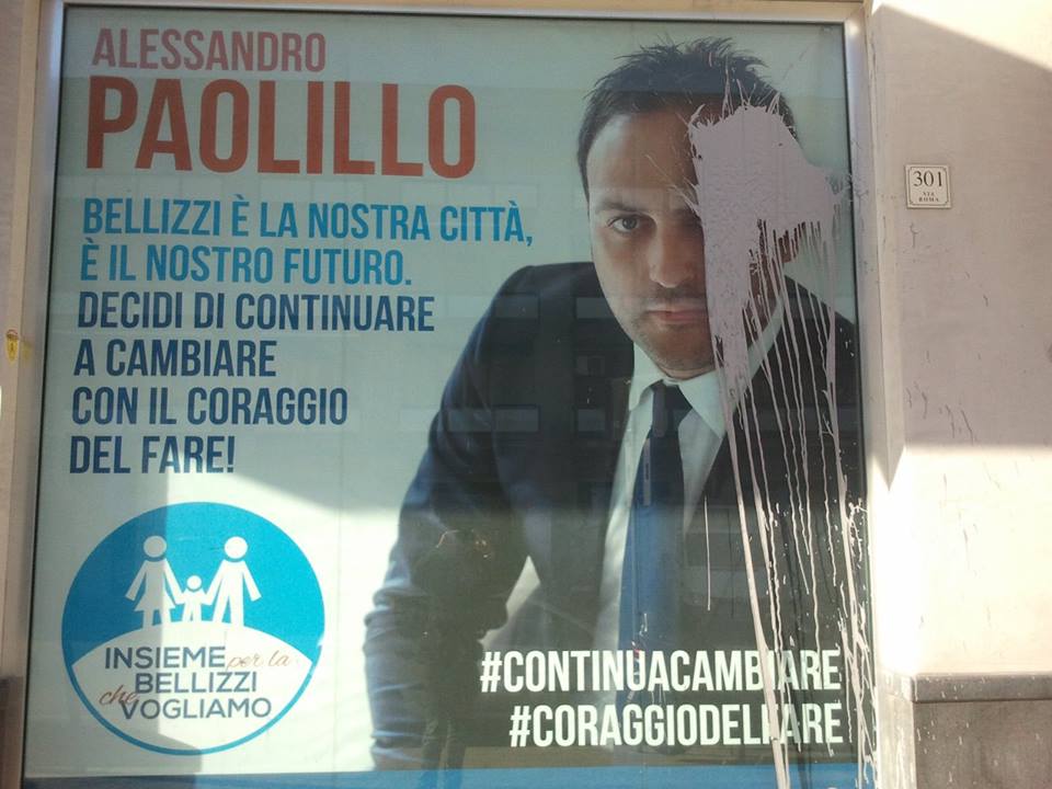 Il fatto di aver imbrattato la vetrina del mio comitato elettorale, aperto solo qualche ora prima, denota la totale inciviltà da parte di alcuni facinorosi che sicuramente non possono e non devono essere definiti cittadini “bellizzesi”.