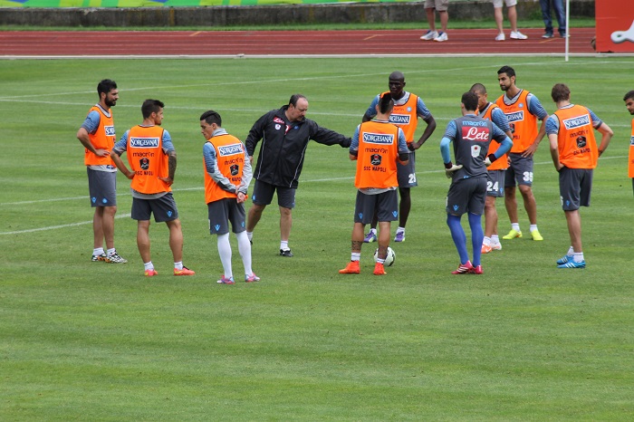L’Allenamento inizia con un giro di campo, poi riscaldamento in due gruppi con il pallone e sgambatura tattica con il pallone, squadra divisa in arancioni contro grigi.Poi dopo squadra in cerchio a colloquio con Benitez e partitella undici contro undici.