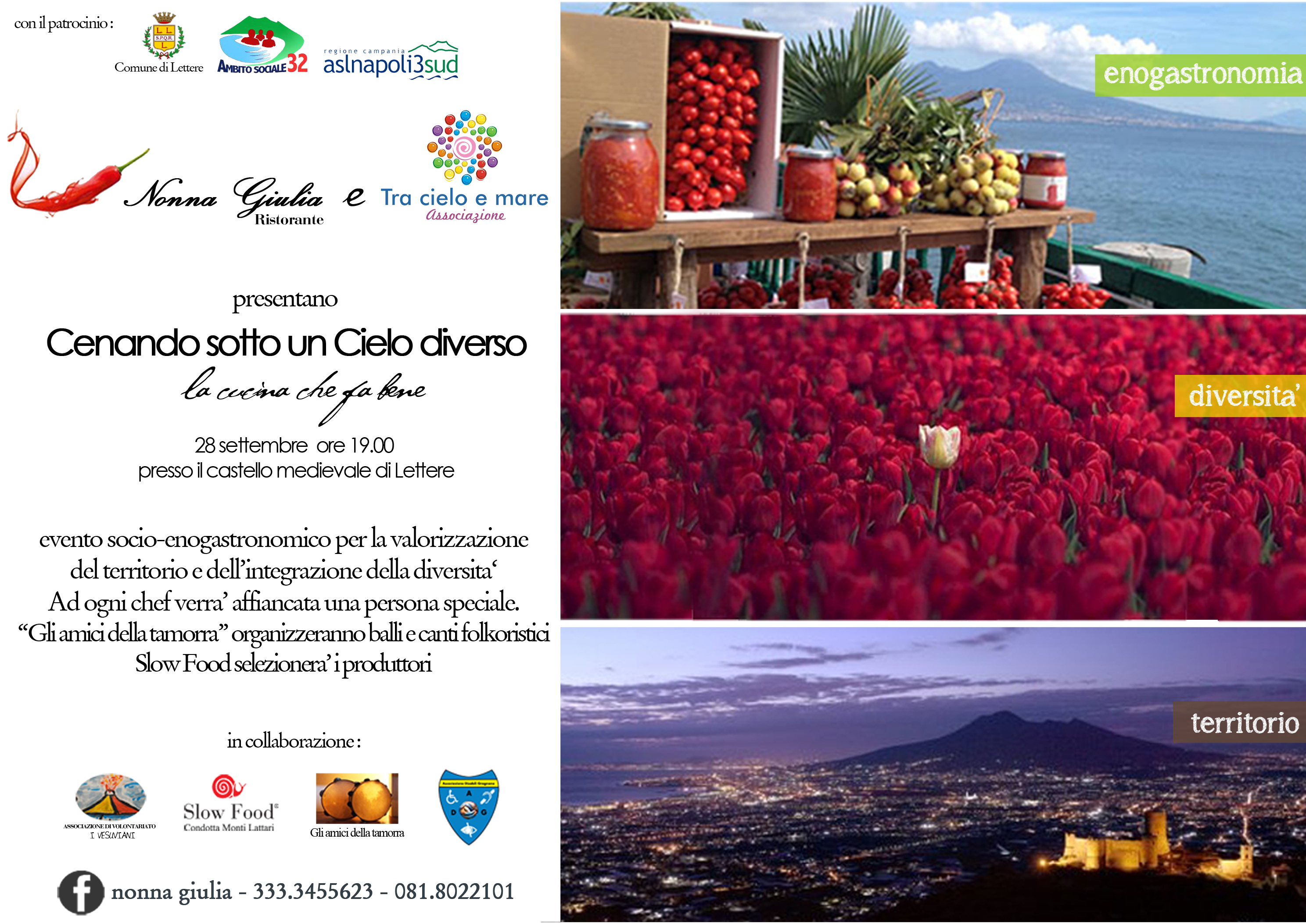 Sapori tipici, bellezza del territorio e solidarietà sono gli ingredienti di Cenando sotto un cielo diverso, , l’evento socio-enogastronomico che si tiene il 28 settembre (dalle ore 19) presso il Castello medioevale di Lettere organizzato dal Ristorante Nonna Giulia e dall’associazione Tra cielo e mare, che operano a sostegno dei giovani con disagio psichico.
