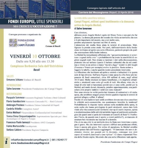 Il convegno dal titolo “Fondi europei, utile spenderli. Ma cresce l’occupazione?” , promosso dalla Fondazione dei Campi Flegrei in collaborazione con il Comune di Bacoli, avrà inizio alle ore 9.30 e terminerà intorno alle 13.30 con la partecipazione di esponenti delle istituzioni e dell’imprenditoria locale che avranno così modo di confrontarsi e porre quesiti sul tema.