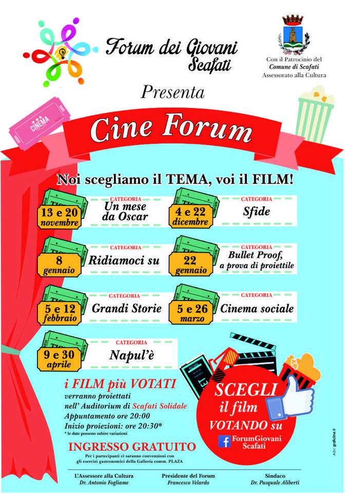 L’originale iniziativa vedrà offerte due proiezioni al mese nell’auditorium della struttura ‘Scafati Solidale’, i film da vedere saranno scelti liberamente dagli utenti tramite un sondaggio online sulle pagine facebook del Forum dei Giovani di Scafati e vedranno alternarsi ben 7 differenti tematiche selezionate con cura dai membri dello staff del Forum.