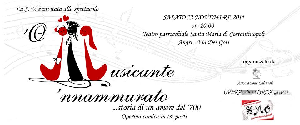 Sabato 22 novembre, alle ore 20:00 si terrà presso il teatro parrocchiale Santa Maria di Costantinopoli, via dei Goti 32, di Angri “O Musicante ‘nnamurato”, un’operina comica in tre parti.