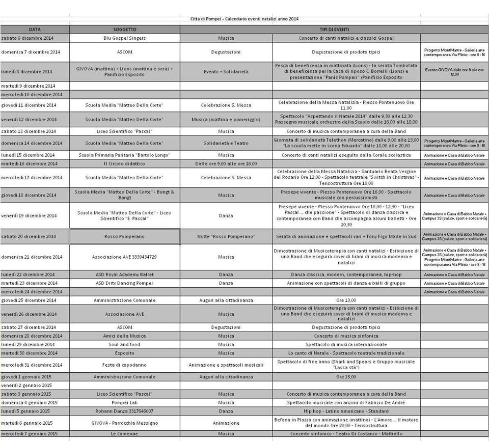 Il cartellone degli eventi, programmati dal 6 dicembre 2014 al 7 gennaio 2015, includerà: spettacoli di musica e danza, esibizioni teatrali, balletti, animazione per bambini, iniziative solidali e degustazioni enogastronomiche. E ci sarà posto anche per due celebrazioni liturgiche e per gli auguri di rito dell’amministrazione comunale alla cittadinanza.