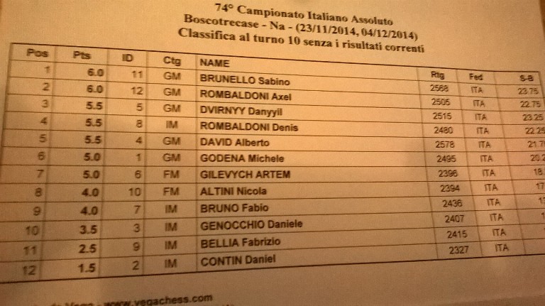 Risultato nono turno : Dvirnyy-Rombaldoni A. ½-½, Gilevych-David A. ½-½, Bruno F.- Genocchio D.1-0, Rombaldoni D-Contin D. 1-0,Bellia F-Godena M. ½-½, Altini N.-Brunello S ½-½.