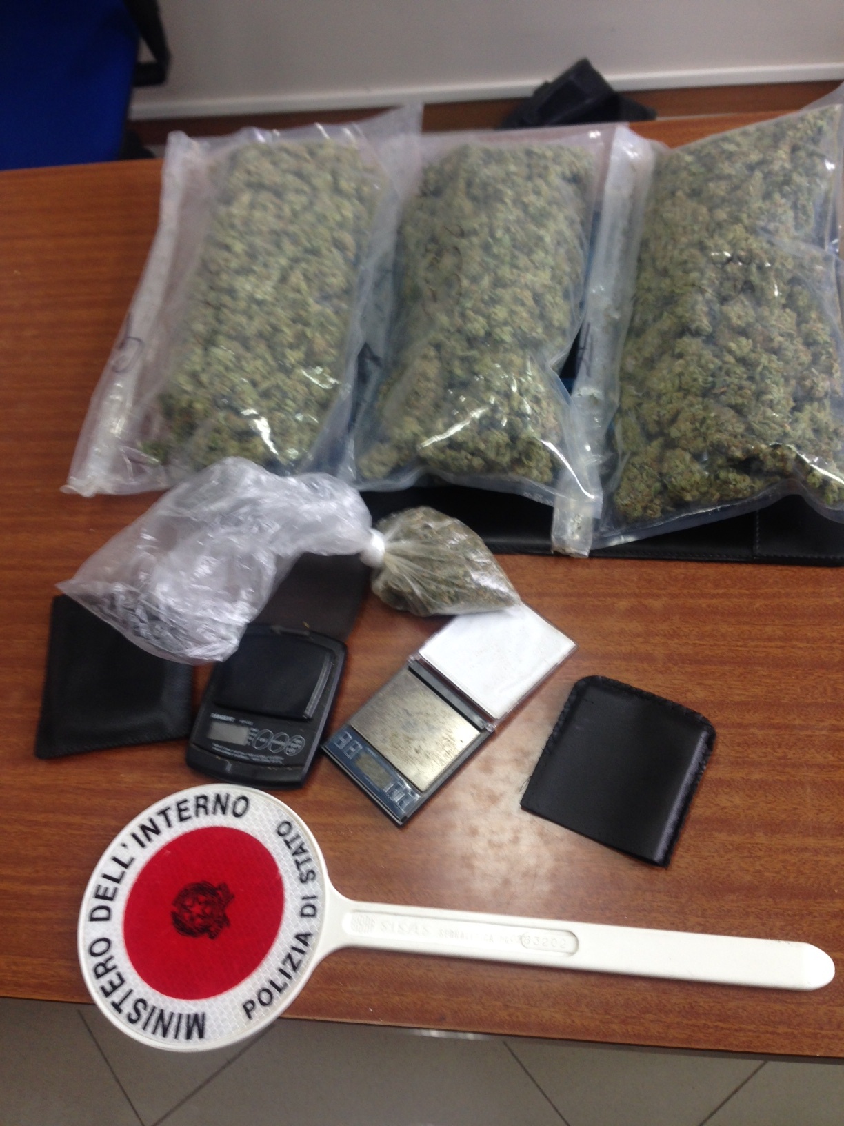 all’interno, quattro buste in plastica contenenti un totale di 750g. di marijuana, due bilancini elettronici di precisione, nonché un altra borsa di colore nero contenente una chiave esagonale, tre cacciavite e due aggeggi metallici modificati ed atti alla scassinatura dei blocchi di accensione dei veicoli.