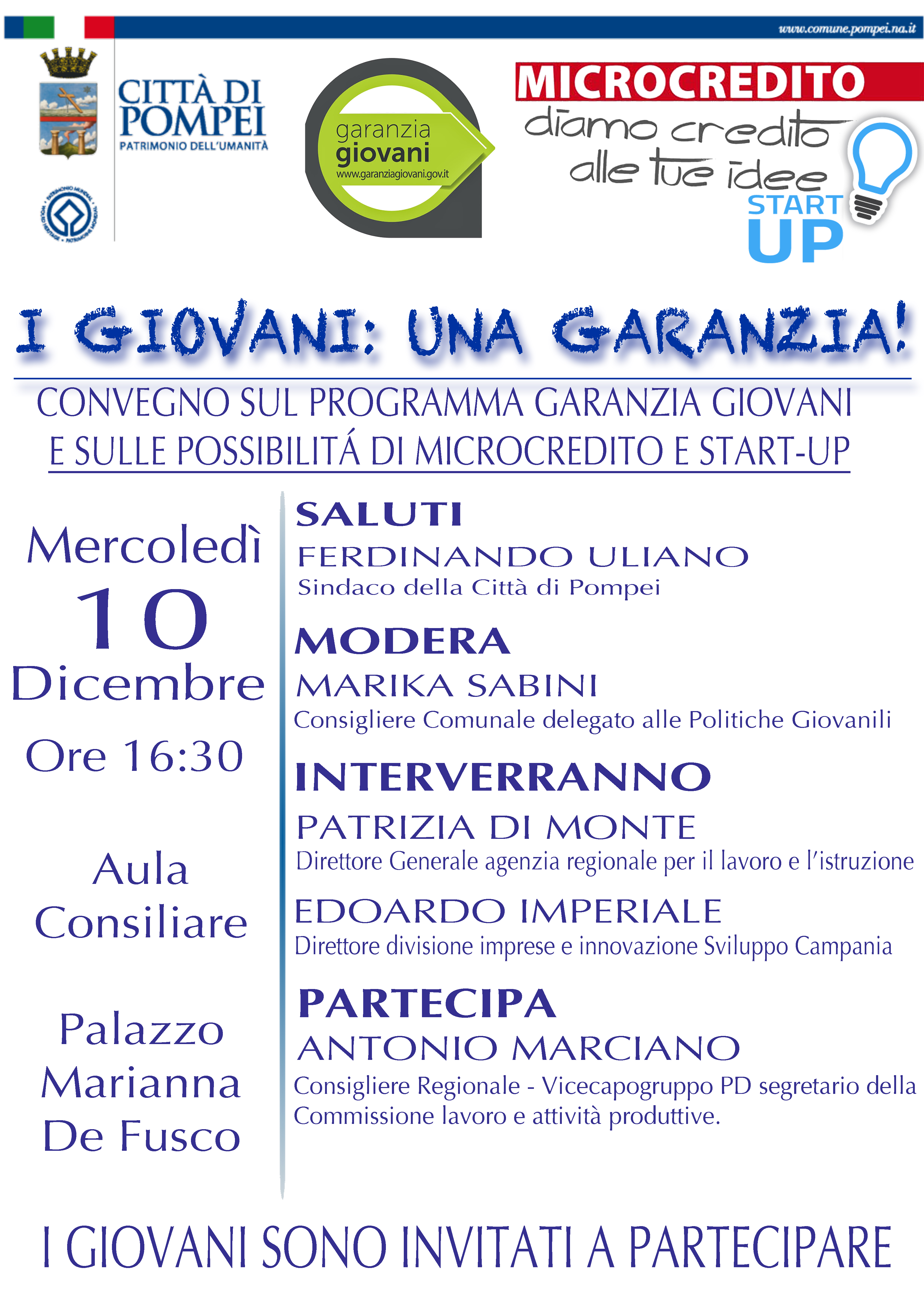 “I Giovani : una Garanzia” . Questo il nome del convegno sul programma “Garanzia Giovani”, e sulle possibilità di microcredito e start-up, che si terrà mercoledì 10 dicembre presso la sala consiliare “Marianna De Fusco” del Comune di Pompei, alle ore 16.30.
