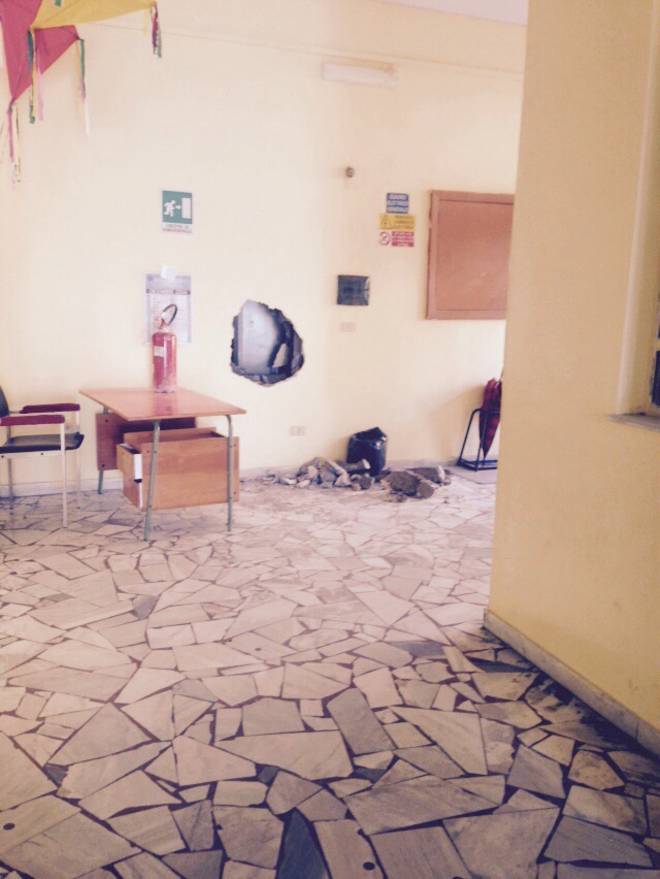 Per fare irruzione nella scuola elementare Gescal, alla periferia di Boscoreale, per la seconda notte consecutiva, hanno praticato un grande buco nella parete «come se volessero entrare nel caveau di una banca», secondo la descrizione di Pasqualina Del Sorbo, preside dell’istituto comprensivo II Dati di Boscoreale.