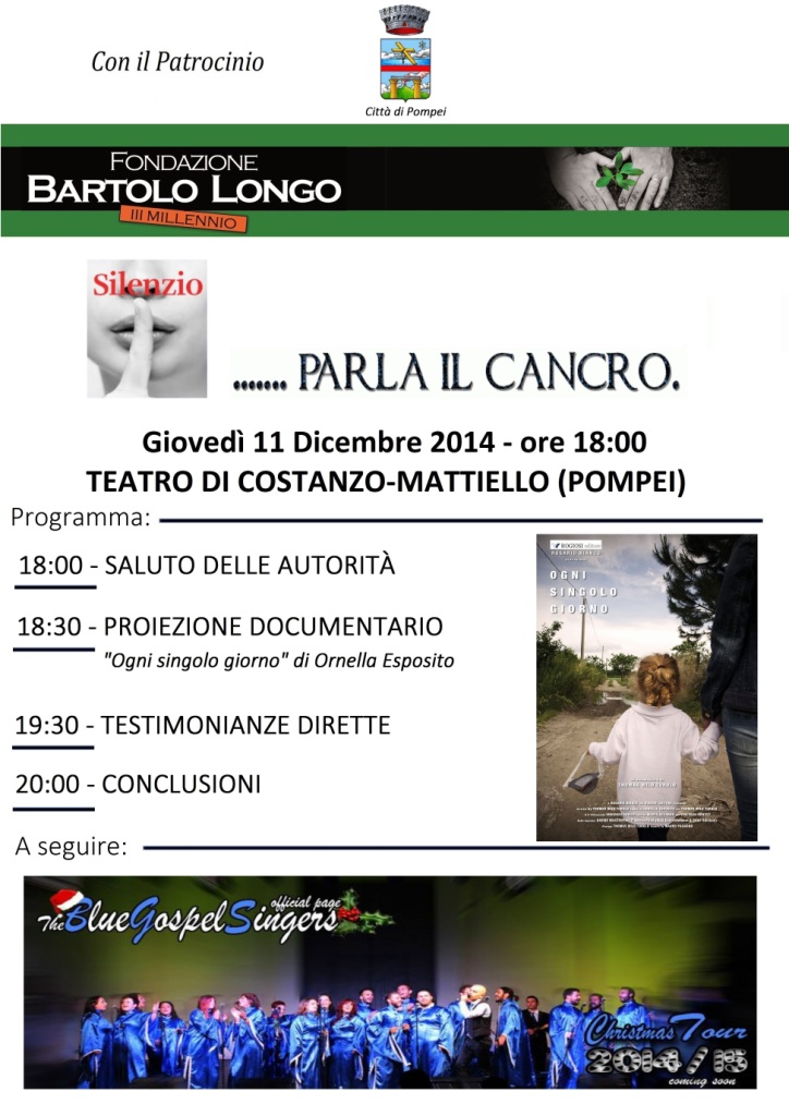 Nell’ambito di quella che viene definita come “medicina narrativa”, la Fondazione “Bartolo Longo III Millennio” di Pompei è presente col suo convegno annuale, dal titolo “Silenzio, parla il cancro”, in programma domani, giovedì 11 dicembre, dalle ore 18.00, presso il teatro Di Costanzo-Mattiello. Interverranno l’Arcivescovo di Pompei, mons. Tommaso Caputo, e il sindaco della Città di Pompei, Ferdinando Uliano.