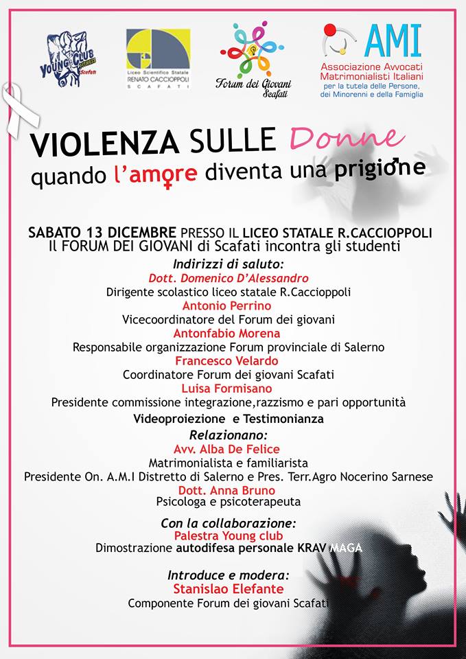 Sabato 13 Dicembre il Forum dei Giovani incontrerà gli alunni del liceo scientifico scafatese Renato Caccioppoli. Verrà trattata una tematica molto importante e, purtroppo, molto diffusa: la violenza sulle donne.