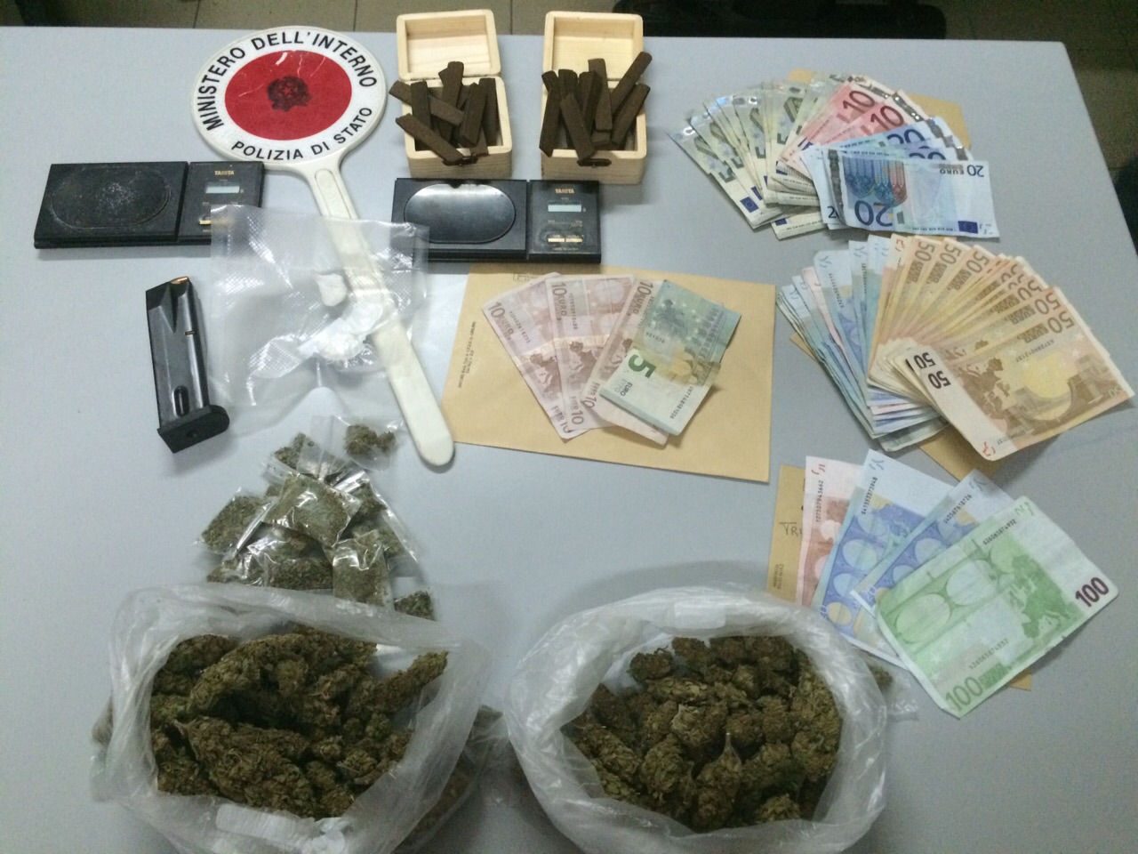 La Polizia ha sequestrato poco più di 120g.di Marijuana, 75g. di Hashish; 0,9 g. di cocaina e 1.260,00 € suddivisi in banconote di vario taglio.