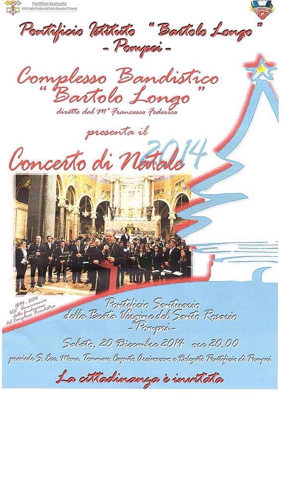 Sabato 20 dicembre, alle ore 20.00, i giovani strumentisti del complesso bandistico “Bartolo Longo-Città di Pompei” saranno i protagonisti del tradizionale Concerto di Natale che, da oltre venti anni, dà il via alle celebrazioni natalizie in Santuario.