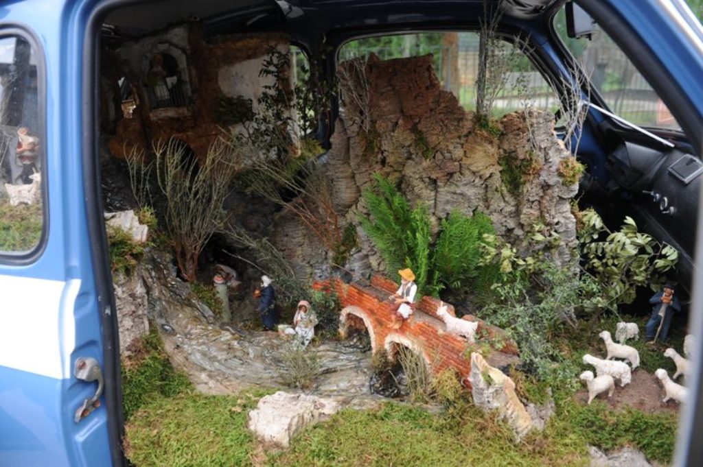 La Fiat Cinquecento della Polizia Stradale è nata 5 anni fa a Caltagirone (CT) con l’intento di unire in un unico oggetto i riferimenti alla sicurezza stradale e all’arte dei presepi.
