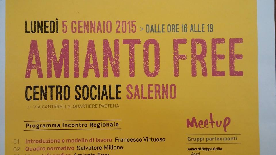 Si sta svolgendo in questo momento a Salerno presso la sala Musica del Centro Sociale ‘Cantarella’ nel quartiere Italia l’incontro regionale campano ‘Città Amianto Free’. Dalle 16 di oggi, oltre 20 gruppi di cittadinanza attiva aderenti al Movimento 5 Stelle, stanno partecipando a questo meeting che si promuove l’obiettivo di creare un documento a firma congiunta che rappresenterà una prima sintesi di un percorso da seguire al fine di costruire soluzioni attuabili e proponibili agli enti preposti, per Legge, alla dismissione dell’amianto in modo lecito e tracciabile.