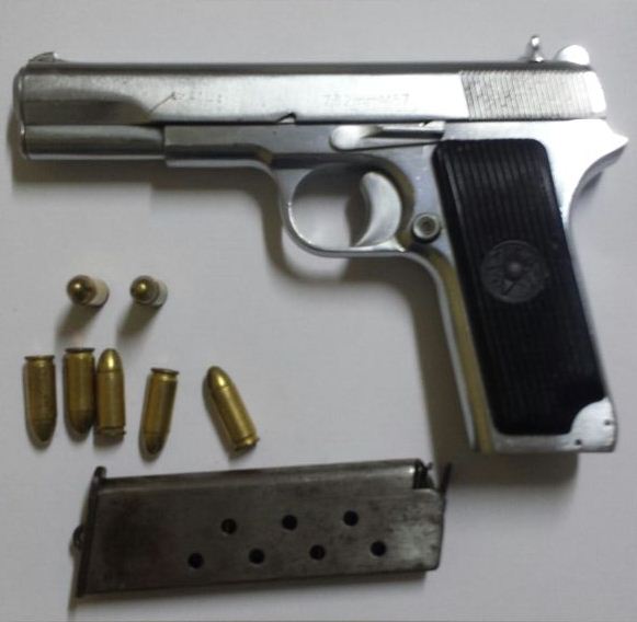 La pistola era occultata sotto dei cartoni e pronta all’uso con 7 cartucce calibro 9 nel serbatoio.