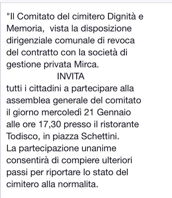 La rescissione del contratto alla società di S.Antonio Abate sarà uno dei temi al centro dell’incontro pubblico promosso dal comitato “Dignità e Memoria” che, da oltre un anno, si batte a difesa di una efficace gestione del camposanto cittadino.