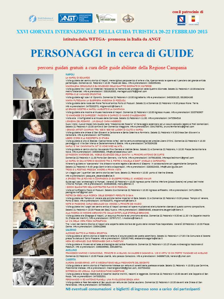 Per la XXVI edizione della Giornata internazionale della guida turistica che cade il 21 febbraio, le guide turistiche italiane, anche quest’anno, offrono visite guidate gratuite alla scoperta delle bellezze nostrane. L’iniziativa è nata nel 1990 con il patrocinio della World Federation of Tourist Guide Associations. In Italia l’evento è promosso da ANGT, Associazione nazionale guide turistiche. Gli eventi promossi dalle associazioni aderenti alla WFTGA si svolgeranno tra venerdi 20 e domenica 22 febbraio 2015. In Campania è l’ Associazione Regionale Guide turistiche campane ad aver organizzato l’evento, il cui titolo è: “Personaggi in cerca di Guida”. Gli itinerari, che sono ben 25, avranno come filo conduttore un personaggio noto o meno noto legato alla storia della Campania. Gli itinerari, sviluppati da guide abilitate della Regione Campania, toccheranno le varie province raggiungendo perfino Procida! Questa XXVI edizione vede l’appoggio e il patrocinio morale della Regione Campania e del Comune di Napoli, e viene sponsorizzata dal Gran Caffè Gambrinus. La prenotazione alle visite guidate va fatta ai numeri di telefono e alle e- mail che si trovano sulla locandina accanto ad ogni itinerario. Per gli itinerari campani è possibile trovare la locandina sulla pagina facebook: Guida turistica abilitata Regione Campania; Per le varie proposte a livello nazionale: