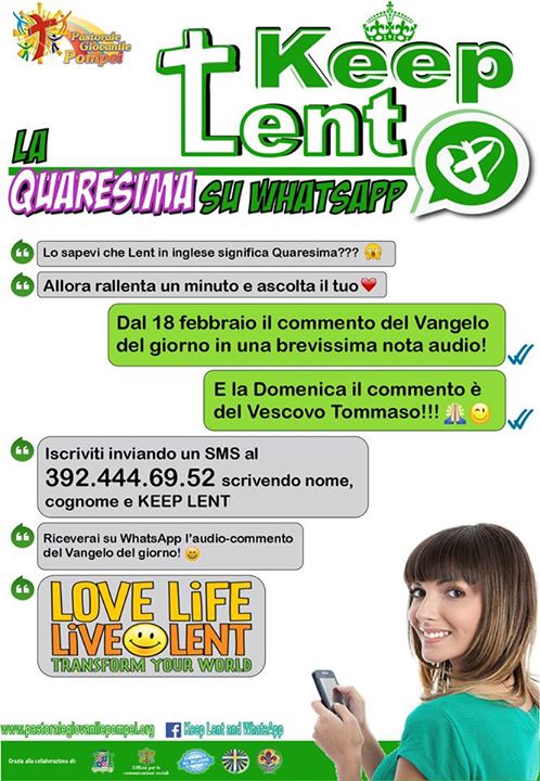 “Keep Lent” è il titolo dell’iniziativa che, ogni giorno, attraverso un gruppo creato sull’applicazione di messaggistica mobile istantanea WhatsApp, regalerà agli iscritti, un momento di ascolto e, soprattutto, di riflessione sul Vangelo del giorno, commentato, di volta in volta, da sacerdoti, catechisti, educatori di Azione Cattolica, insegnanti di religione, da membri dell’èquipe di Pastorale Giovanile e dal gruppo Agesci. Ogni domenica, a commentare il Vangelo sarà mons. Tommaso Caputo, Arcivescovo della Chiesa pompeiana.